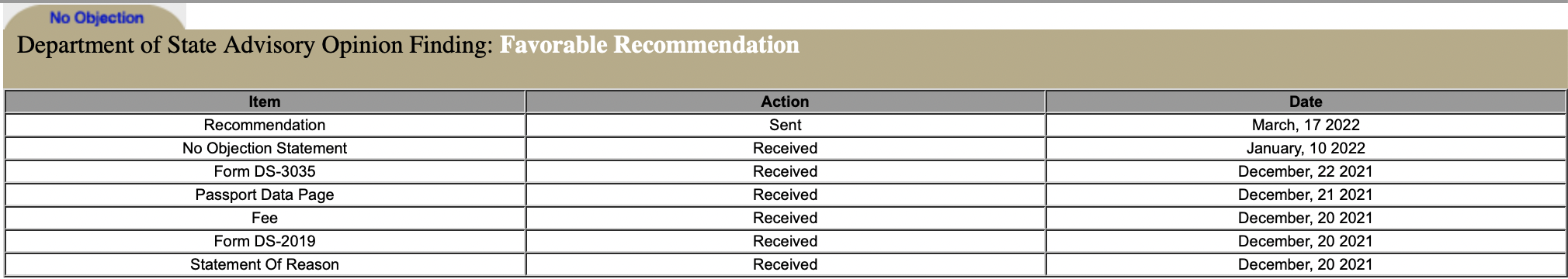 Then on March 17th, I received a favorable recommendation. I think they accepted my expedited processing, even though it was not shown online.