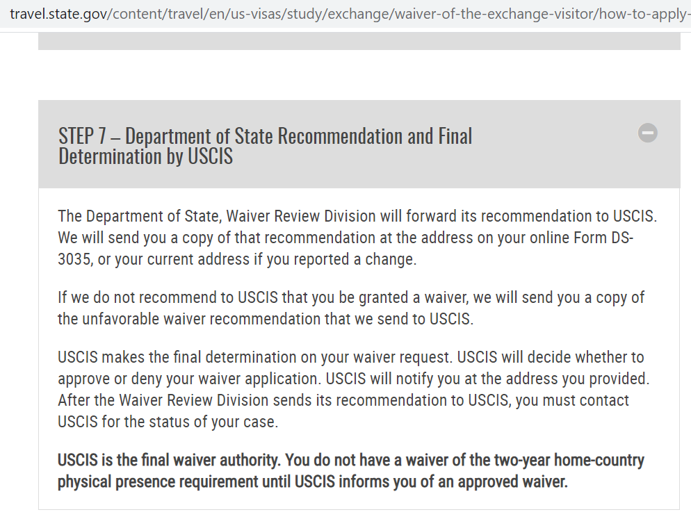 (https://travel.state.gov/content/travel/en/us-visas/study/exchange/waiver-of-the-exchange-visitor/exchange-waiver-faqs.html) states explicitly that