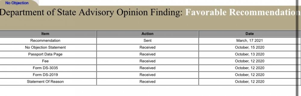 however, 2 months passed, and our lawyer got suspicious. We contacted NIH, and the confirmed that they never received a request for sponsor views. We updated my senator, and they were able to get the DOS to finally request the sponsors views. NIH agreed to expedite the case, so I am waiting on them, and then will ask the DOS to expedite the case as they delayed the process a few months.