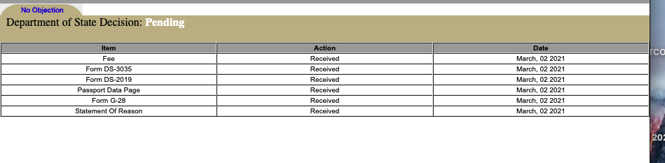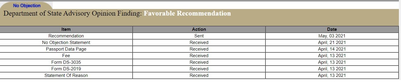 "Due to the COVID 19 pandemic there is a delay in the processing of No Objection Statements sent by mail to the Waiver Review Division. Please encourage your Embassy in Washington DC to submit your No Objection Statement electronically. No Objection Statements sent directly by the applicant will not be accepted."