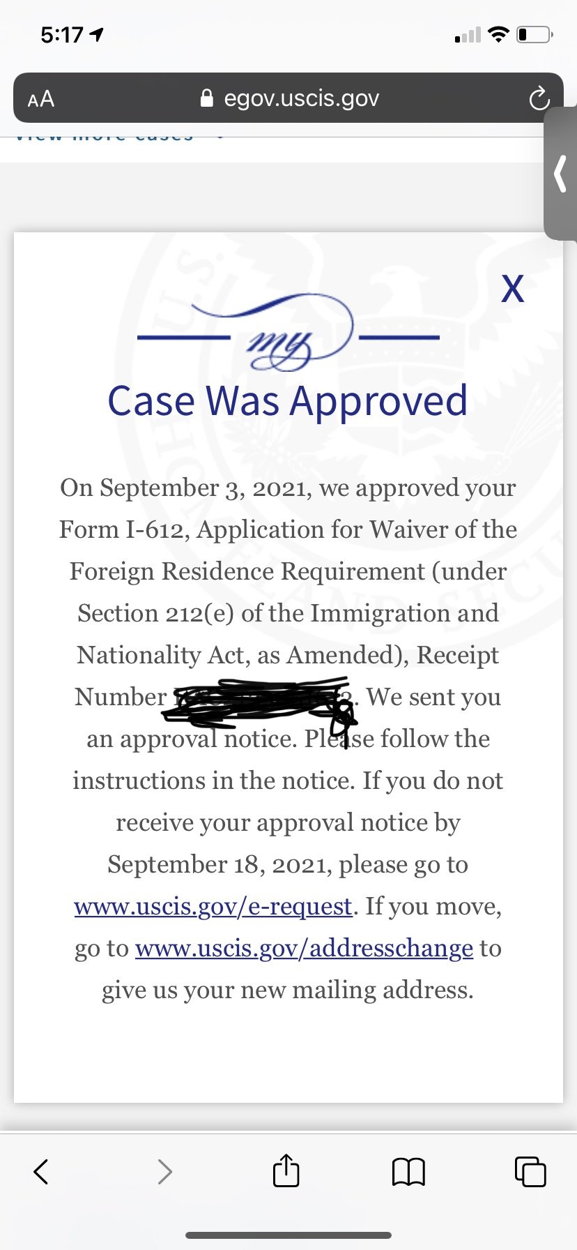 On September 3, 2021, we approved your Form I-612, Application for Waiver of the Foreign Residence Requirement (under Section 212(e) of the Immigration and Nationality Act, as Amended), Receipt Number EAC XXXXXXX. We sent you an approval notice. Please follow the instructions in the notice. If you do not receive your approval notice by September 23, 2021, please go to www.uscis.gov/e-request. If you move, go to www.uscis.gov/addresschange to give us your new mailing address.