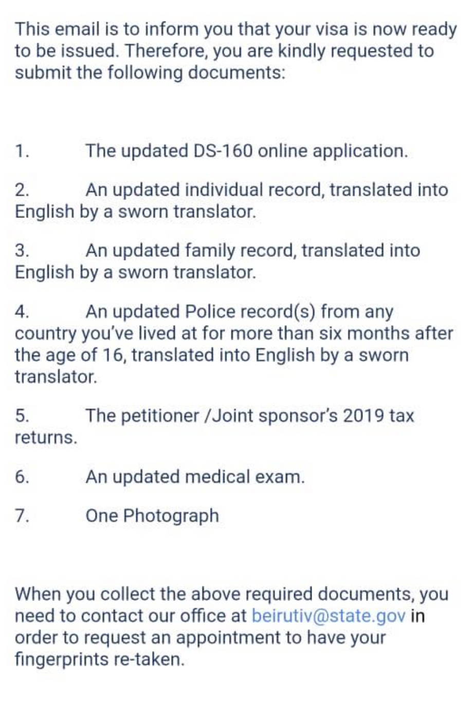 My fiance got the email attached below. I wanted to see if anyone could help out or has had a similar situation. Once we collect all the papers do we mail it to the embassy or do we take it in during his appointment? The police certificate from Syria was waived during his interview and they also emailed me saying it is waived. Now they are requesting it again? We cannot obtain this, should we just take a print of the email I have on hand that says the officer waived the requirement?