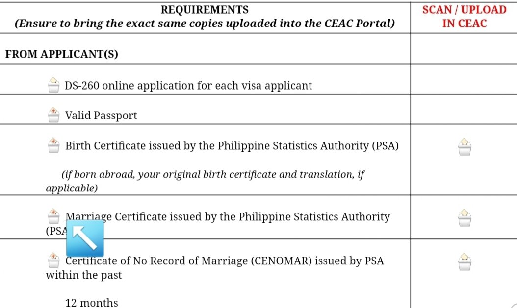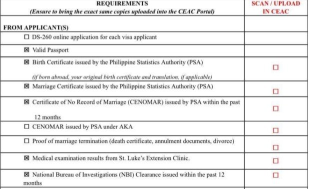 "Congratulations on your upcoming immigrant visa interview.  Your file is now with the U.S. Embassy in Manila.  Please bring the original copies of the documents marked below (except for the Affidavit of Support, which can be a copy).  Please also scan and upload documents into the CEAC portal (using your login) for the documents marked in RED.  Instructions on how to upload documents into the CEAC portal is also attached for your reference."