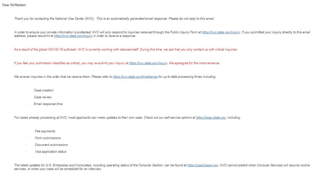 No one needs to send an inquiry to NVC as it has been written in about every thread that NVC is not going to move the completed files to the embassy till the embassies open and ask for their case files. Just keeping it real. If you are referring to get your case number you don't email them as they will not reply with a case number until the file is shipped. You can call them and get the case number and with the CN you can finish the DS-160, Online Nonimmigrant Visa Application but that's about all. You don't want to schedule medical or book an interview if your case is not at the embassy. We find the embassies lock down ustravel so that you are unable to schedule if our case file is not at the embassy.