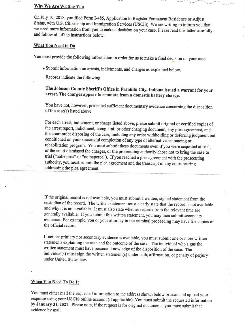 as you know since I received RFE about a criminal charge as Domestic battery after my I485 interview. I was posted my questions here and got some good  advices that I need find a good criminal attorney to dismiss this case. REF dead line is 1/31/21.