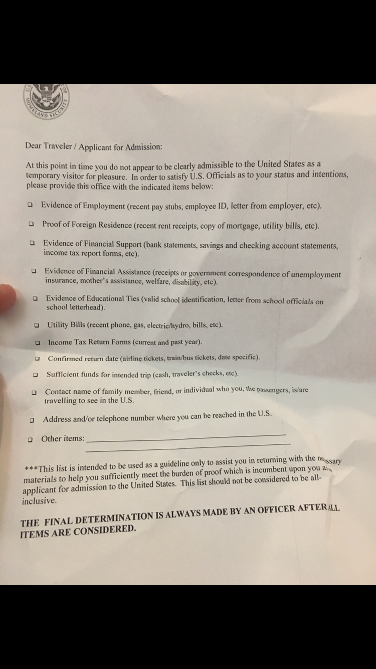 1. When can he try again? He’s contemplating getting more documentation and buying a round trip ticket to US this time before giving up and returning to Montreal.