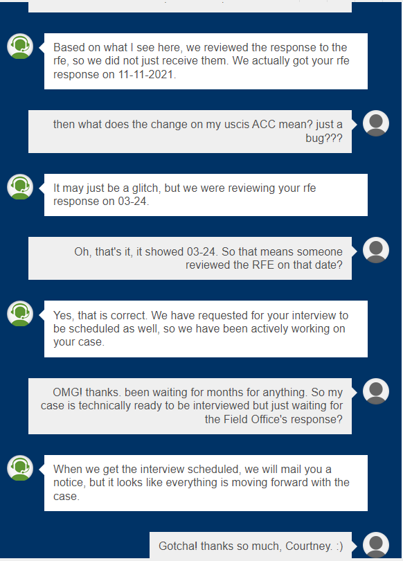 You could chat with Emma and ask for a status update, and whether that means the RFE was reviewed and an interview was requested. That was the case for me. Doesn’t change all that much (I am still waiting for an *actual* status change), but it did give me a slight boost to know that someone had actually looked at my filing.