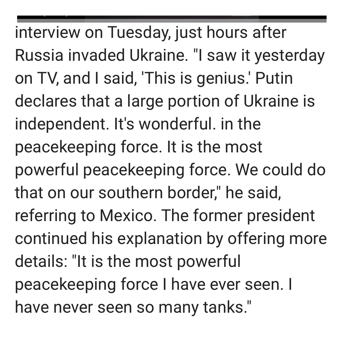 So, Putin is now saying, “It’s independent,” a large section of Ukraine. I said, “How smart is that?” And he’s gonna go in and be a peacekeeper. That’s strongest peace force… We could use that on our southern border. That’s the strongest peace force I’ve ever seen. There were more army tanks than I’ve ever seen. They’re gonna keep peace all right. No, but think of it. Here’s a guy who’s very savvy… I know him very well. Very, very well.