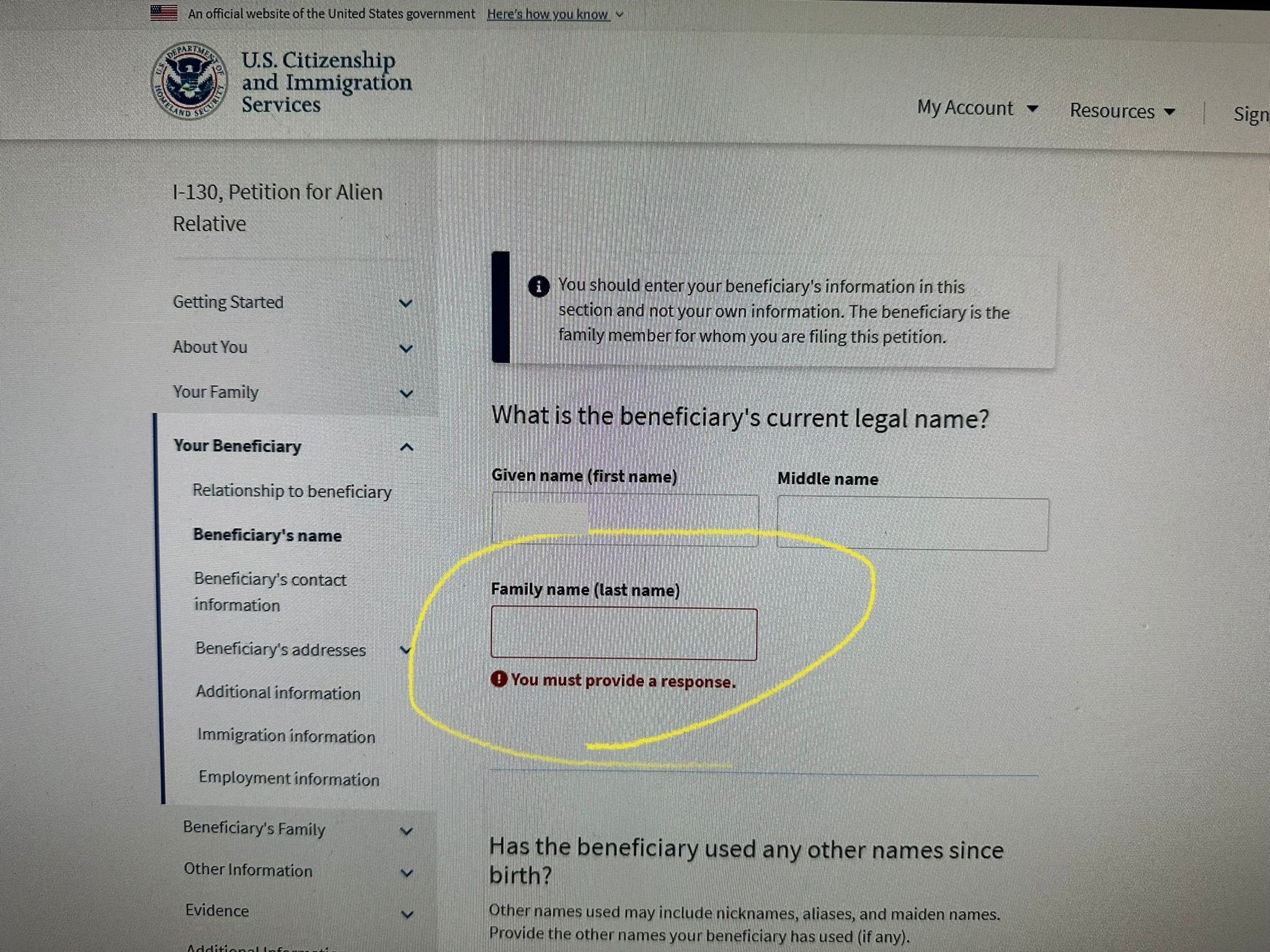 when I fill her i130 form online what do I need to write in the box of "Last Name"?