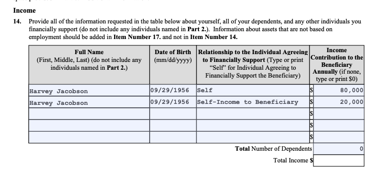 Full Name (Sponsor) - Date of Birth - Self - Income Contribution to Beneficiary - $20,000