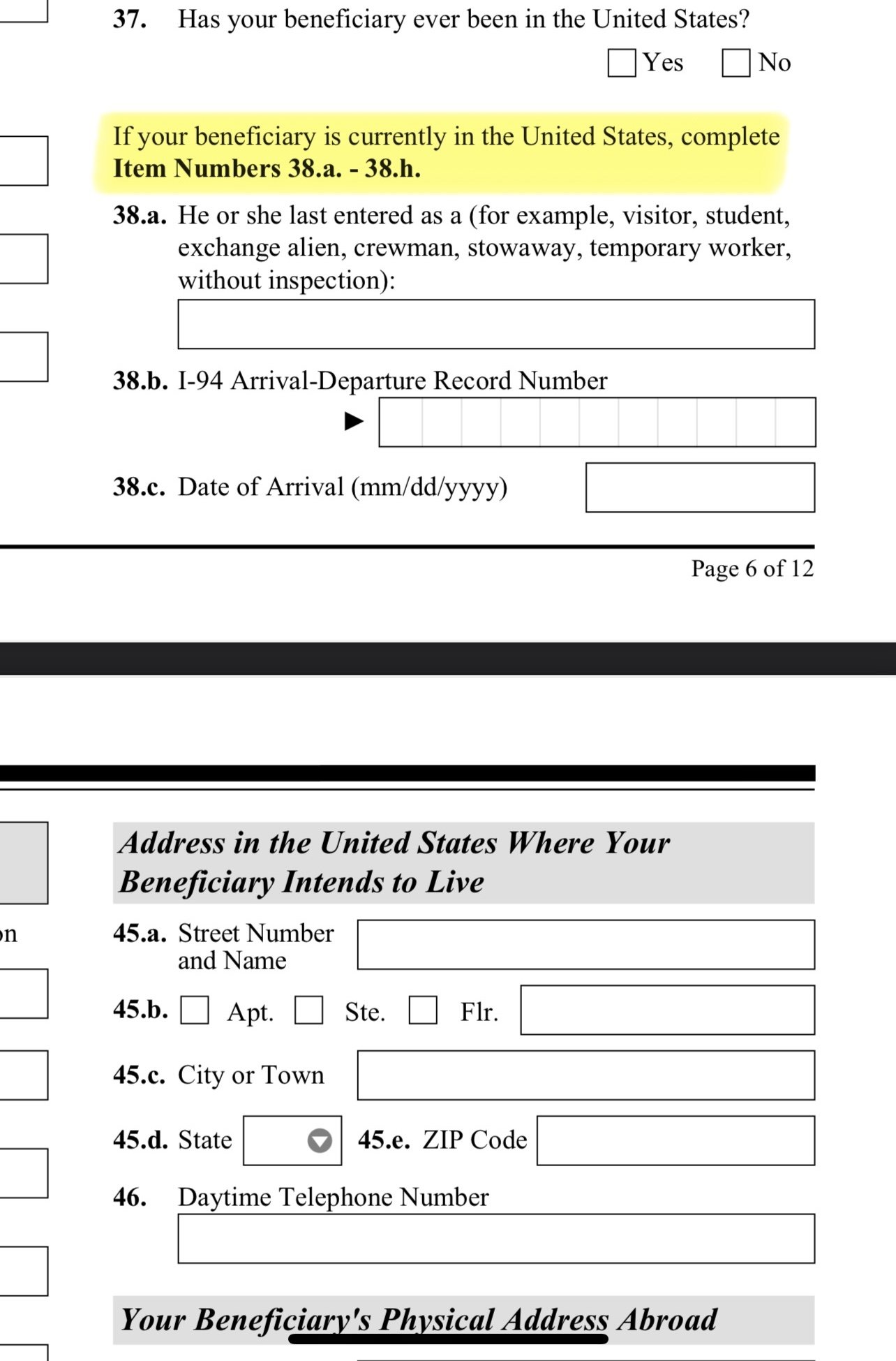 Hello, can anyone help? I am in the process of filling out the I-129F form and I’ve come across an issue. On the form it asks “If your beneficiary is currently in the United States, complete Item Numbers 38.a. - 38.h.”