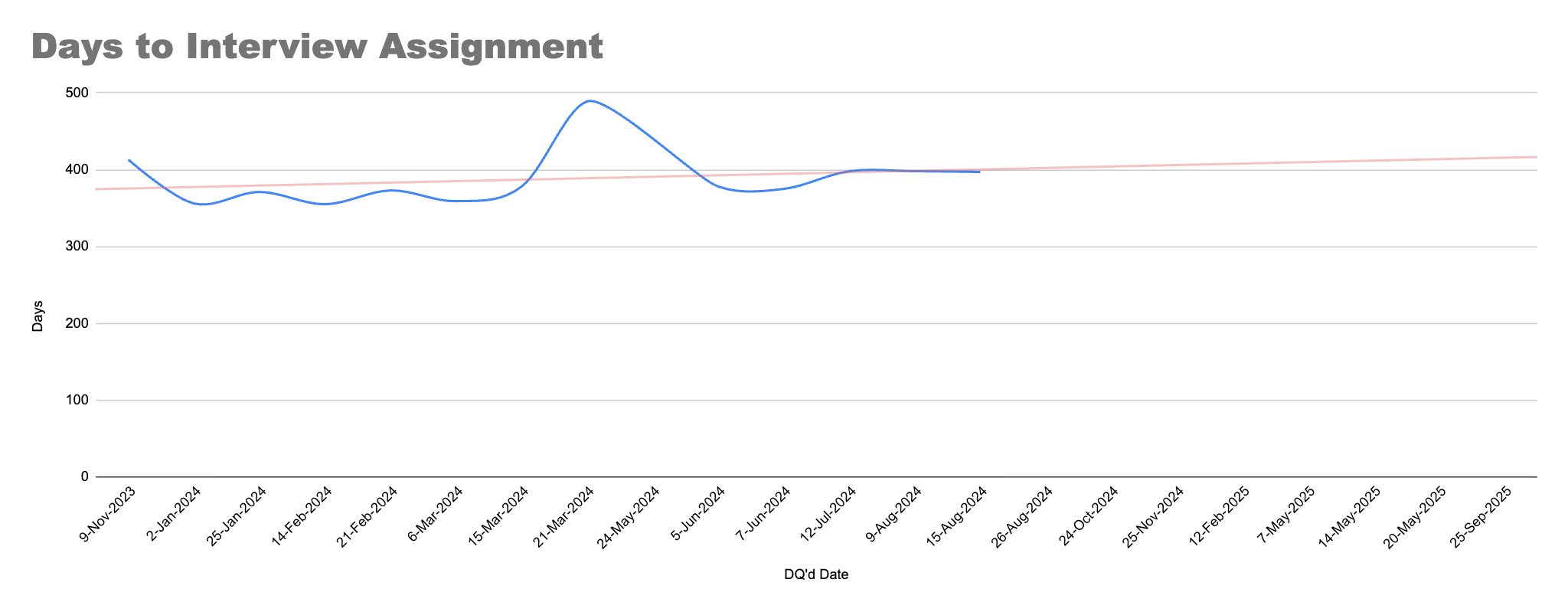 Friends, here is another chart I made from the data I've collected. It shows the DQ'd dates of the couples I've spoken to on the x-axis and the time they waited before receiving their interview date. You can see the line is trending upward slightly, but only just a little. The wait is just under 400 days for the most recent data.