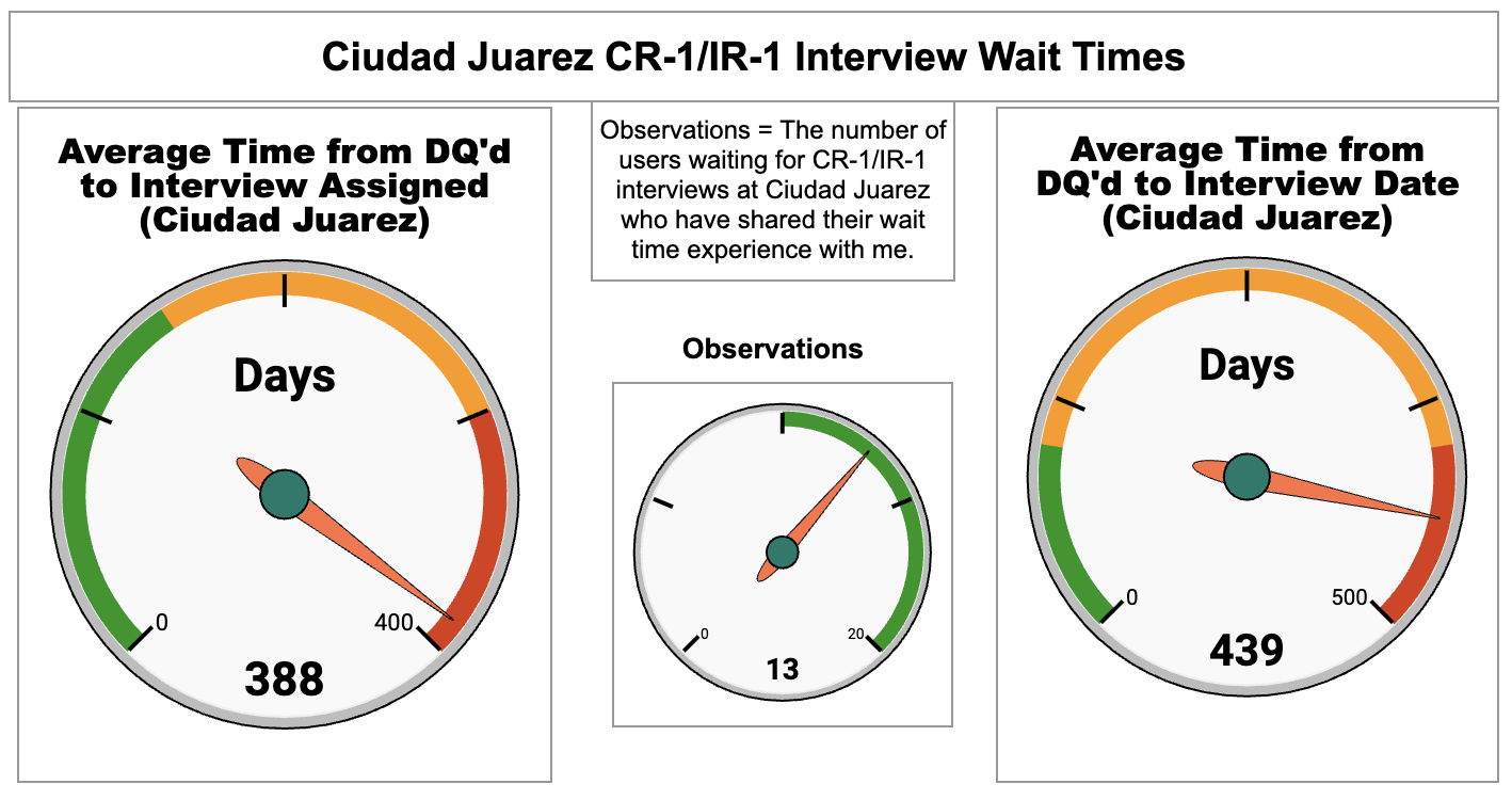 Good morning, friends. I wanted to share an update on Ciudad Juarez interview wait times. This data only applies to IR-1/CR-1. As always, you can see my specific data points here: https://docs.google.com/spreadsheets/d/1omDM3XmhO72N-KcYG-lpadogppY3iIjXXUuB7iLoYD4/edit?gid=258561260#gid=258561260