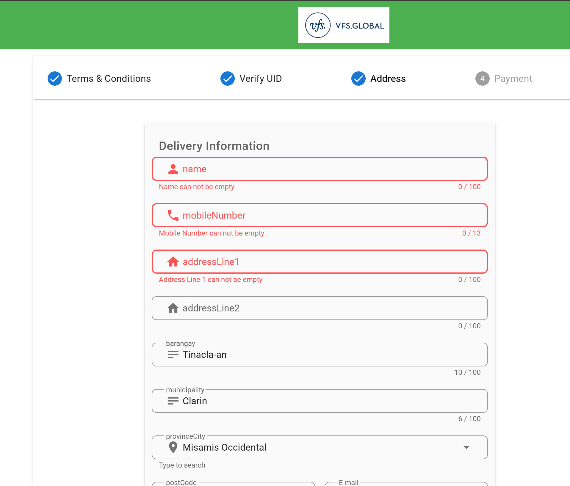 When making the payment on the VFS website it has this section titled "Delivery Information". I am assuming I should put the beneficiaries name and beneficiaries home address here even though we are not having the documents delivered to that home address? And then in the reply email to the email we received, we will put the 2GO location in the body of that email? Or are we supposed to put the 2GO address in this screenshot of the VFS payment portal?