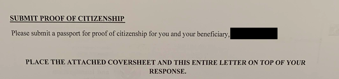 "Please submit a passport for proof of citizenship for you and your beneficiary."