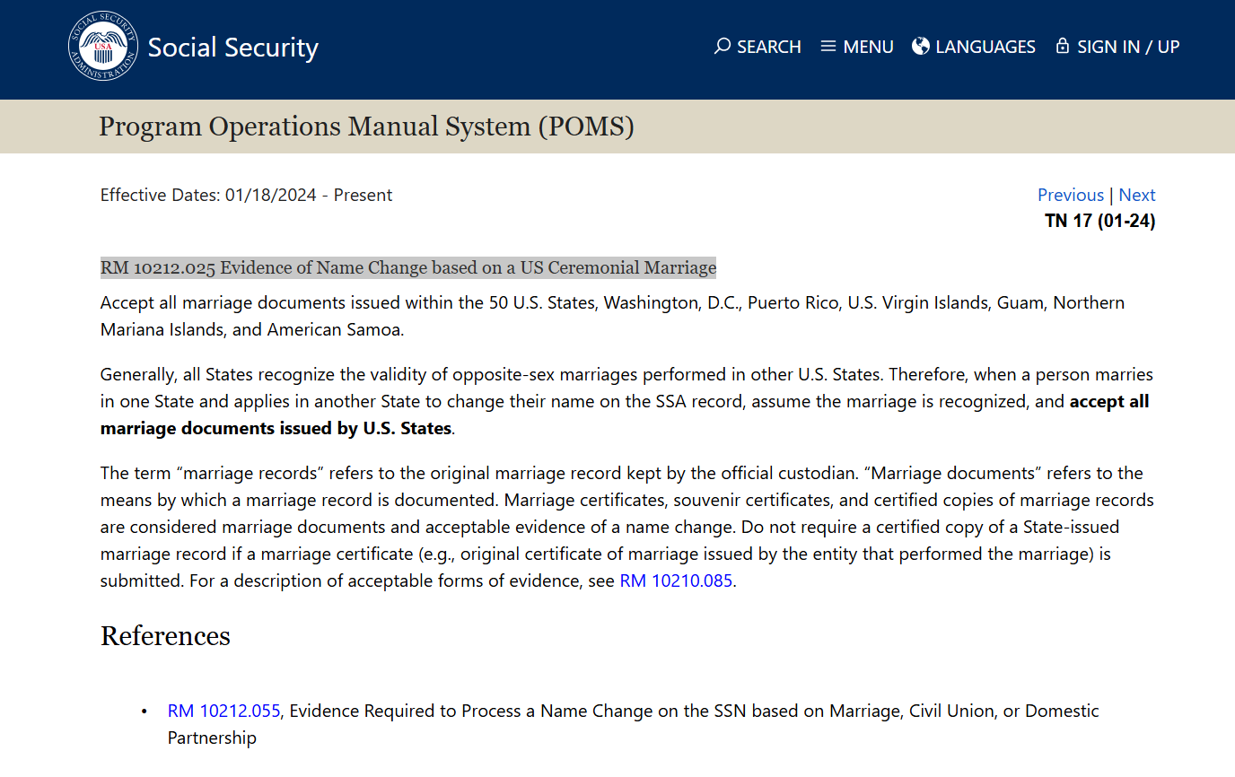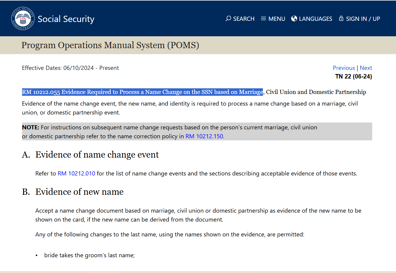 RM 10212.055 Evidence Required to Process a Name Change on the SSN based on Marriage