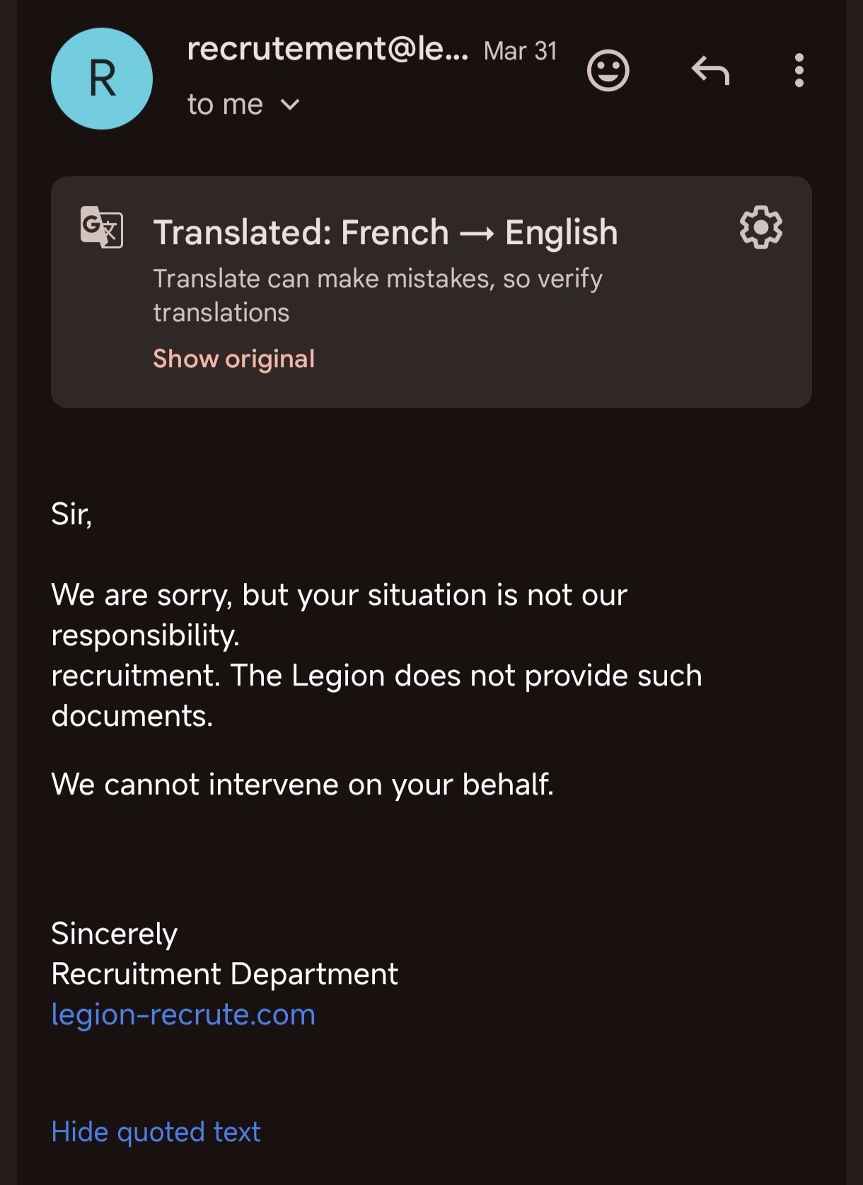 I have written an email to the French embassy, who told me that they are unable to help and that I must write an email to the Foreign Legion head office, which I did and got no response. I wrote to their recruitment office email and got the following reply: