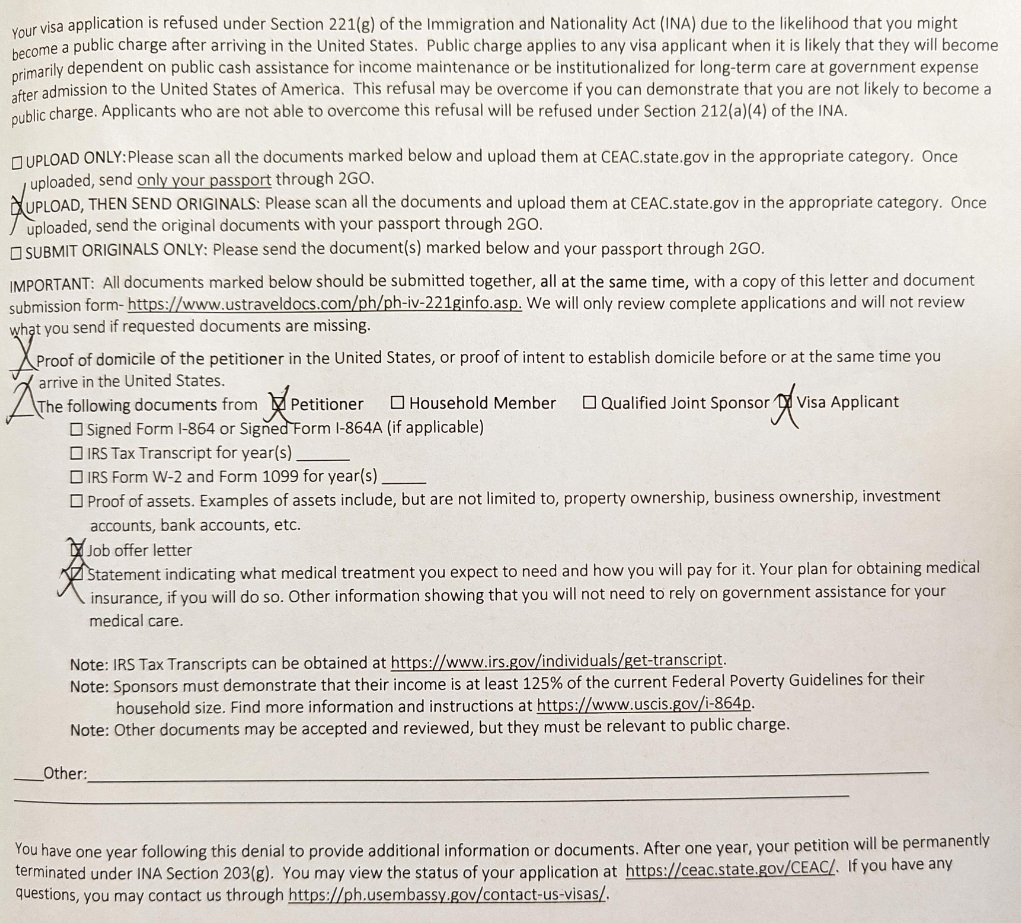 Check out the 221g itself and give comments to provide insight. Is it possible to have a second look at this from a different officer who would hopefully go over the full evidence more closely? Do people view this also as the only option is that the petition needs to work immediately? Obviously if they toss aside the joint sponsor then it is understandable that even with that amount of assets it's not a particularly large amount over the guideline amount.. though it's obviously better than an unemployed petitioner who has close to nothing as well as not a close relationship to her parents and no reliable home. I would have thought the totality of the situation would have been enough here compared to plenty of other cases.