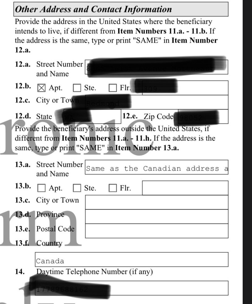 1 RepliesHello, there s a small typo on my filed i130 form. Under Other Address and Contact Info for the Beneficiary, 13f is filled out but the address is the same as item 11. Is a correction needed to explain that 13f should be blank or can we leave it as is? If a correction is needed, what would be the best way?