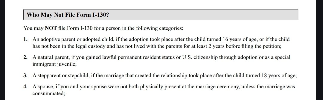 However, I read in the instructions provided from the official website of american immigration where you formally do all the applications like the I-130 form and in the section marked "Who may not file form I-130?" it states, "you may NOT file form I-130 for a person in the following catagories: 4.) A spouse, if you and your spouse were not both physically present at the marriage ceremony, unless the marriage was consummated".