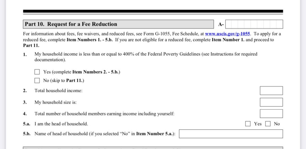 Hello everyone I am confused how to fill out this part 10 of N400 application. It is about fee reduction. But I qualify for fee waiver because my income in less then 150% of FPL. In part 10 do I answer yes or no to first question and what about other questions do i leave them blank or fill them. If I leave them blank won’t it be considered incomplete application? And if i fill them won’t it be considered request for fee reduction? i am filling separate i-912 fee waiver along with N400. Your help is appreciated.