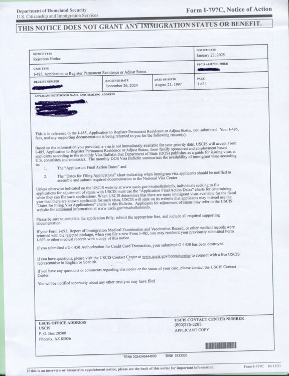 Your 1-130 form is being returned to you because the eligibility you filed under requires that you file an I-485 also. Please resubmit both forms and the appropriate fees in order to continue processing.