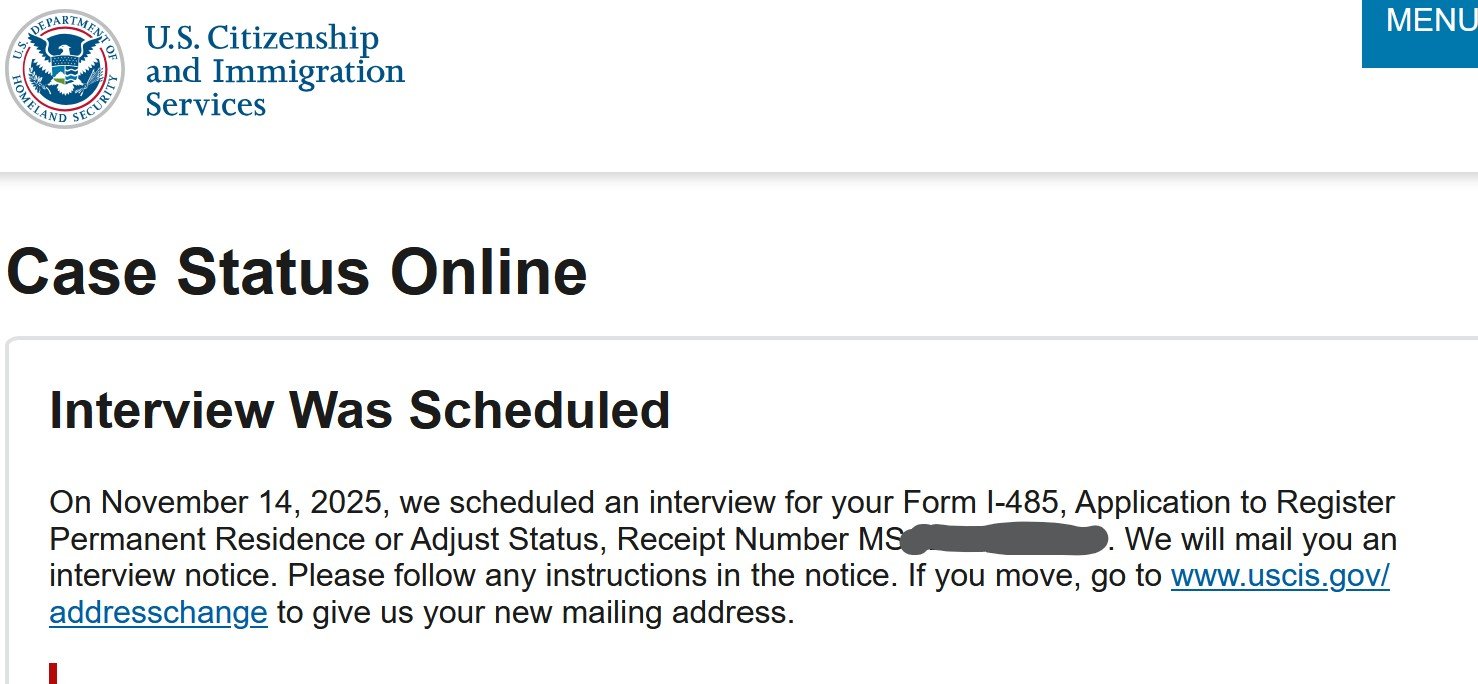 Still no update on her work authorization (last update was ~28 days ago saying they transferred her case to another office), but so happy we got an update for the green card at least! For their cases, we can't check online, we have to wait until the notice arrives in the mail to see when the interview is scheduled for (please don't be December 4th or 5th).